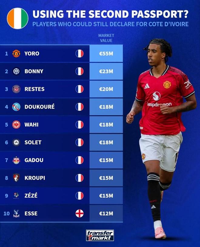 德转列有资格入选科特迪瓦队多国籍球员身价前10: